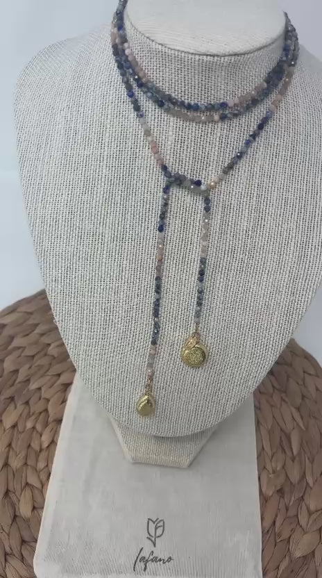 4mm Sodalite beads with copper gold-plated charm accents. Measures 48" in length. Stainless steel gold-plated finishings.