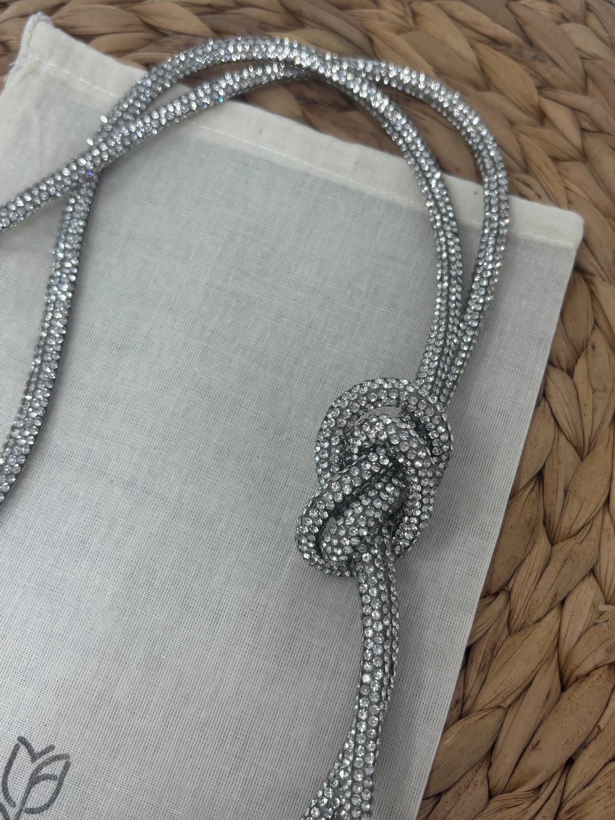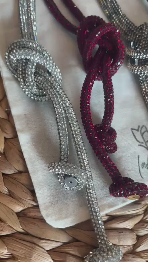 Introducing the Gatsby Necklace: an elegant piece that adds timeless sophistication to any outfit. Measures 44" in length and can be worn in various different ways. Material is soft cloth with crystals.