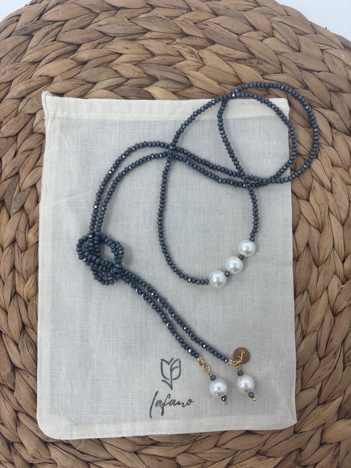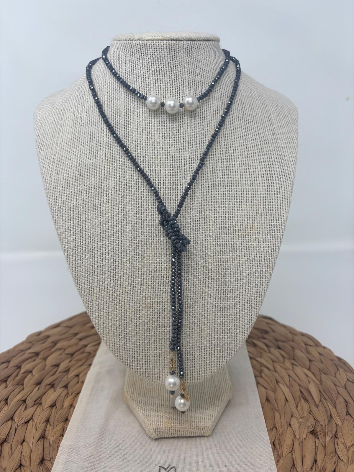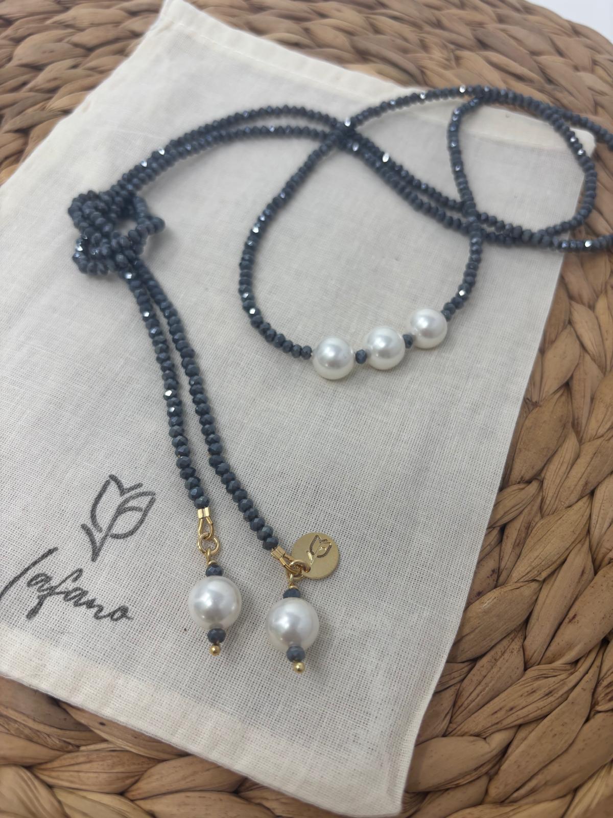 Small 4mm gray-metallic crystal beads with shell pearl accents. Measures 46" in length. Stainless steel gold plated finishings.